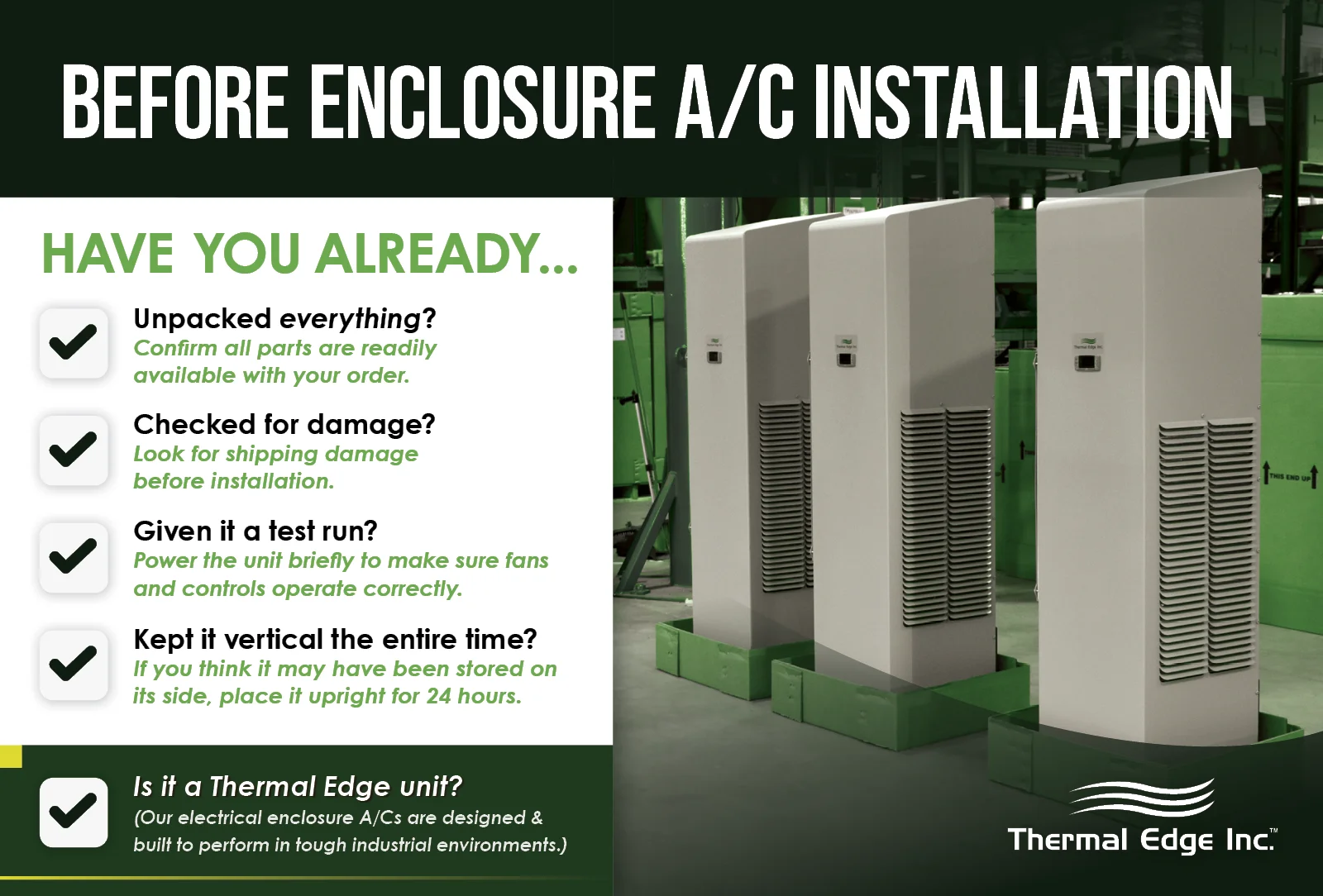 Before installing your electrical enclosure air conditioner, it’s wise to check that it’s the correct unit, it’s in working condition, and after installation, that it’s operating correctly. This checklist covers these points, although full details can be found in the User and Technical Manual shipped with the unit or here if you have purchased from Thermal Edge.